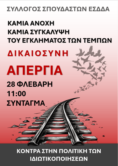 Στις 28 Φλεβάρη κλείνουν δύο χρόνια από το έγκλημα των Τεμπών και η ΑΔΕΔΥ προκηρύσσει πανελλαδική 24ωρη απεργία. Ο Σύλλογος Σπουδαστών ΕΣΔΔΑ θα συμμετέχει με δικό του πανό στις 11:00 π.μ. με εκ νέου ενημέρωση για το ακριβές σημείο συνάντησης. Σας καλούμε να συμμετέχουμε όλοι μαζί στην απεργία για να μην συγκαλυφθεί το έγκλημα των Τεμπών, για να αποδοθεί δικαιοσύνη, ενάντια στην εκμηδένιση της ανθρώπινης ζωής στον βωμό του κέρδους και των ιδιωτικοποιήσεων, ενάντια στην εγκληματική πολιτική!